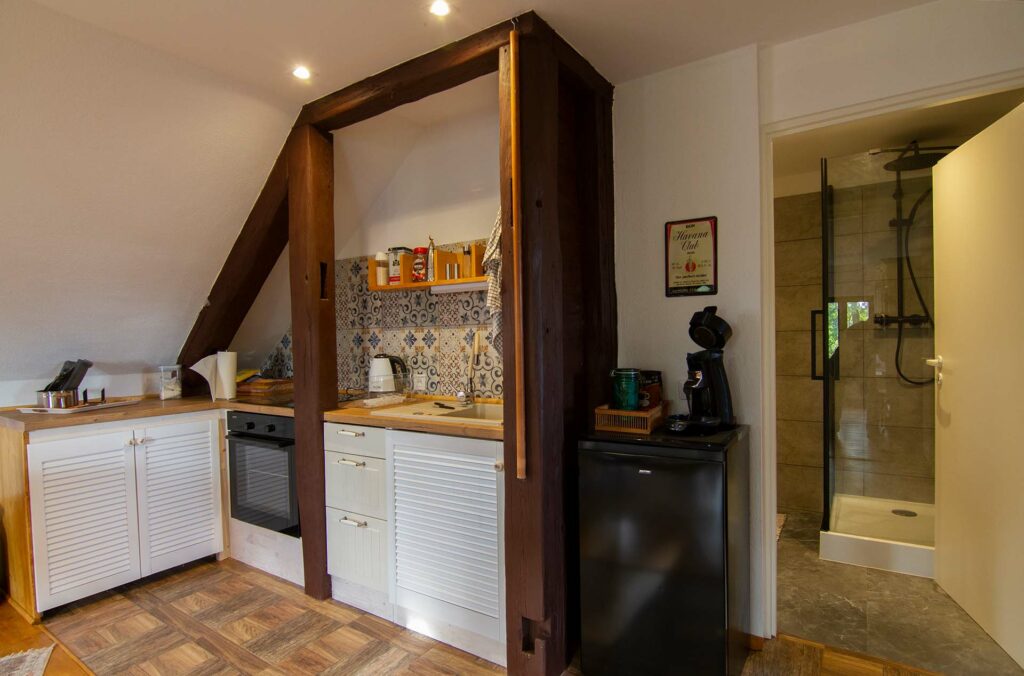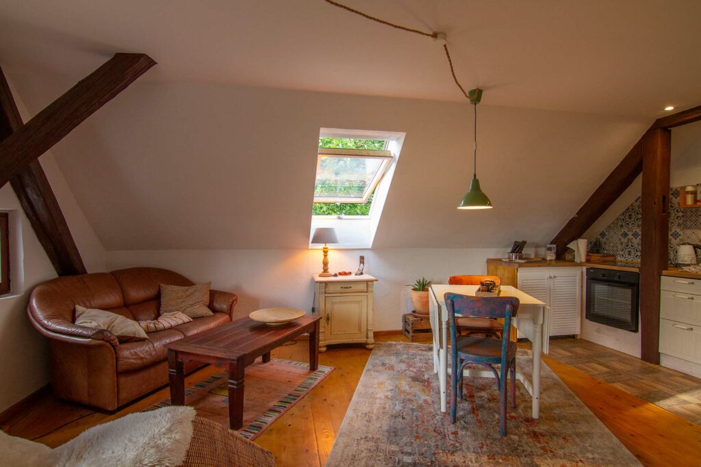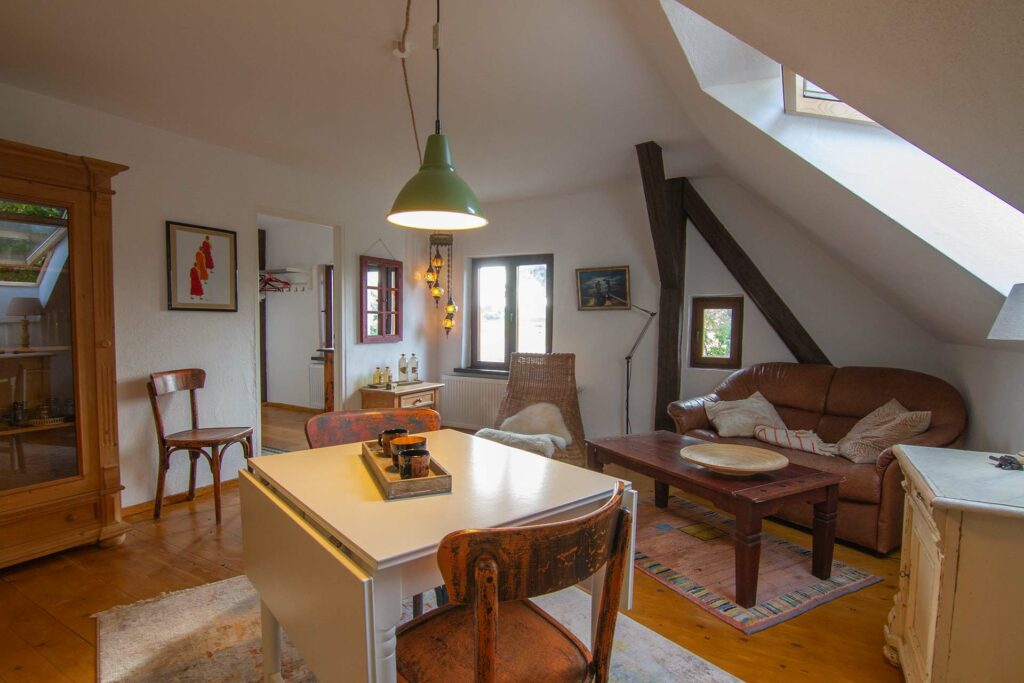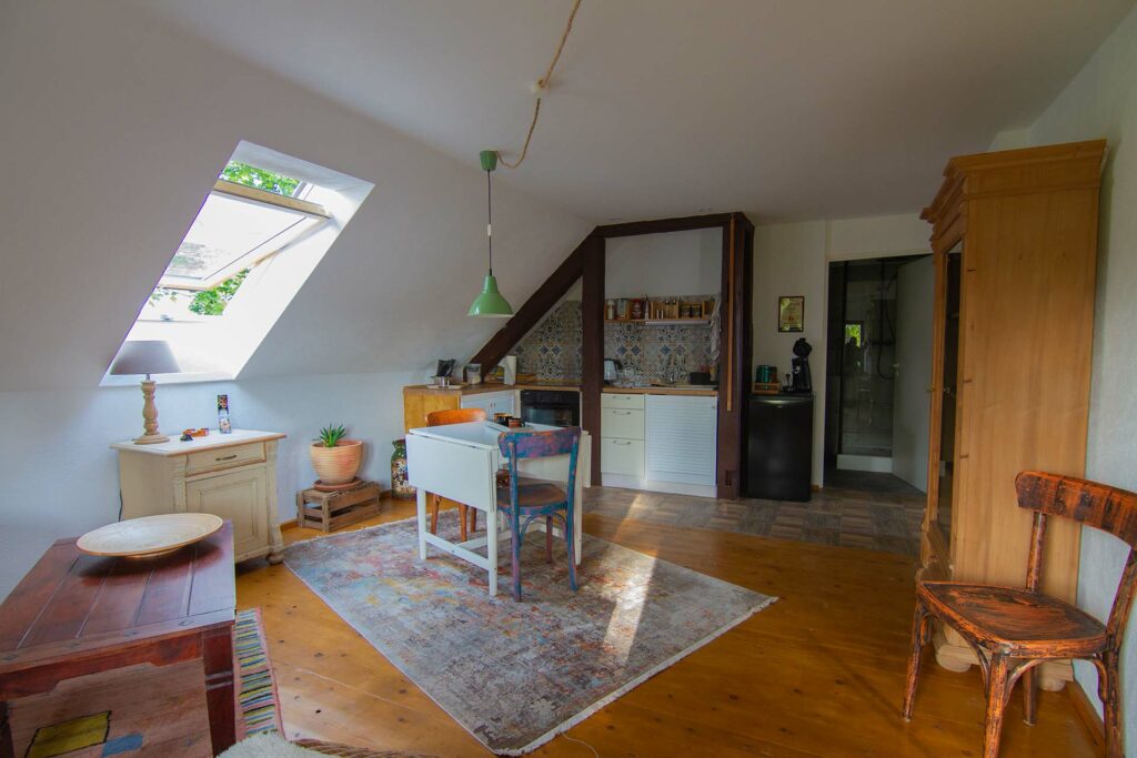 Das lichtdurchflutete Appartement befindet sich im Haupthaus mit separatem Eingang. Es gibt einen großen Wohn,-Ess und Küchenbereich, einen Schlafraum und ein Bad mit Dusche. Im Schlafzimmer kann ein Kinderbett zugestellt werden.