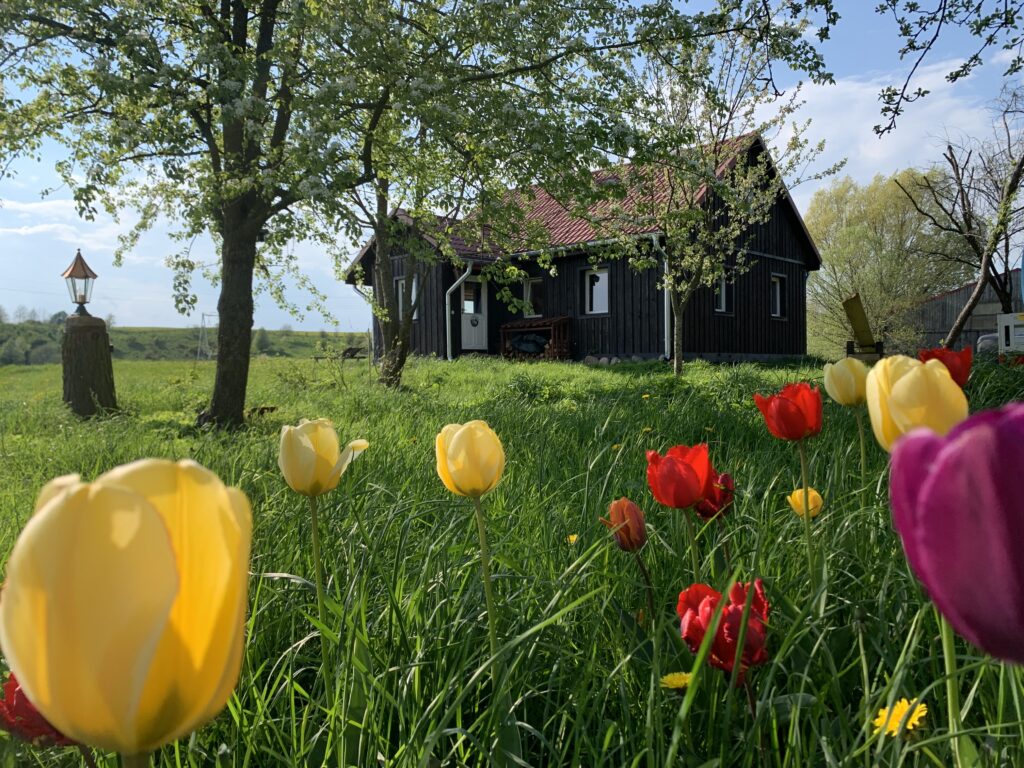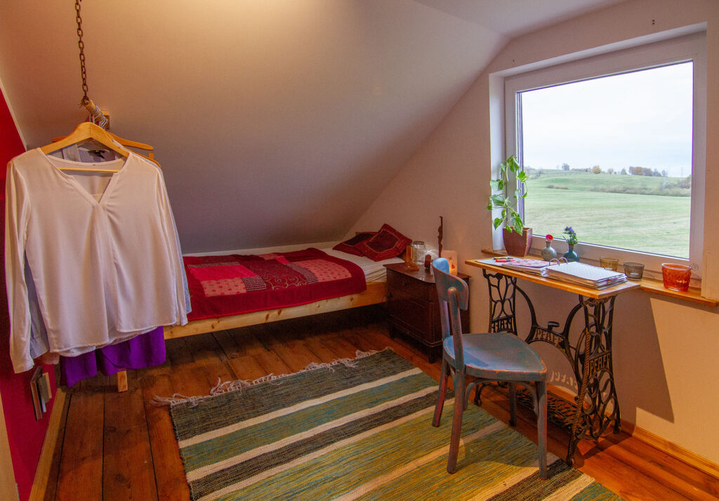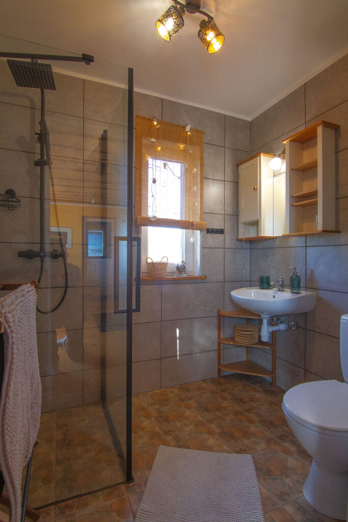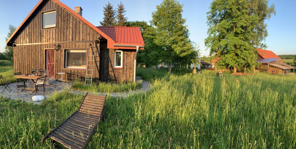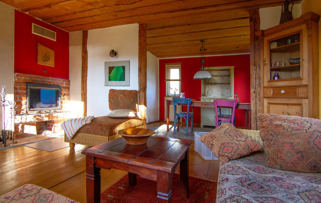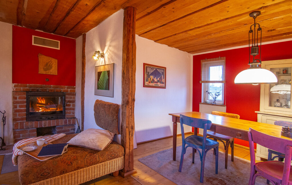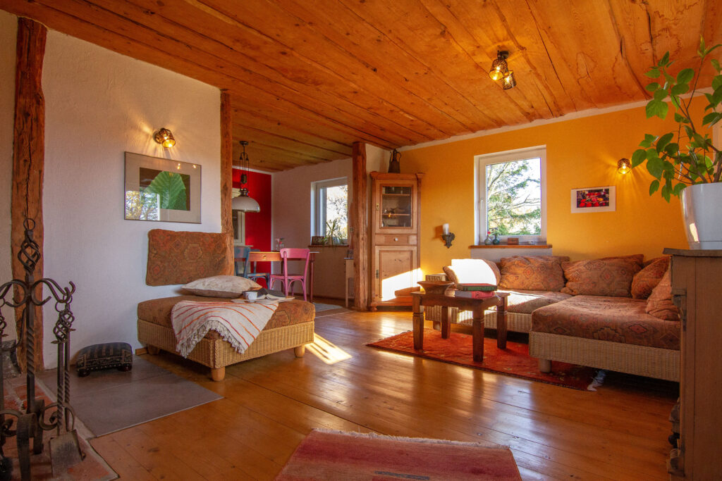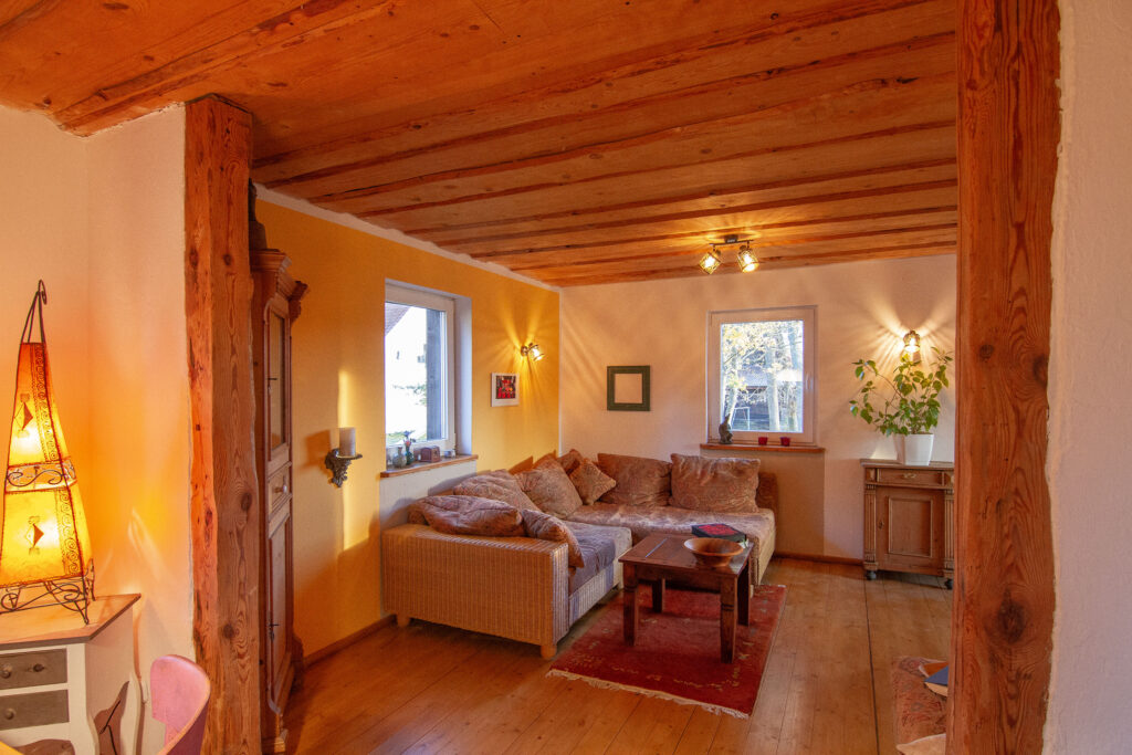 Das Holzhaus liegt separiert vom eigentlichen Hof und bietet im Erdgeschoß einen großen Wohnraum mit Kaminofen, einen Küchenbereich mit Zugang zur gepflastertenTerasse und das Badezimmer mit einer ebenerdigen Dusche.