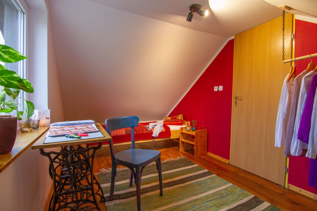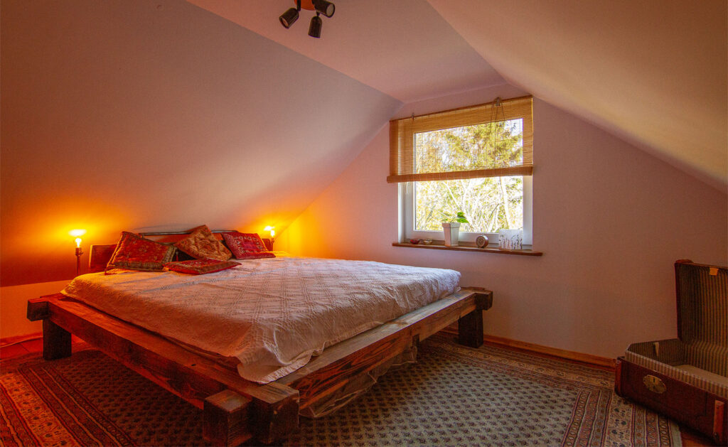 Im oberen Geschoß befinden sich zwei Schlafräume, ein großzügig bemessener mit Doppel-Bett ( 1,8 x 2m ) und ein kleinerer mit 2 einzelnen Betten.